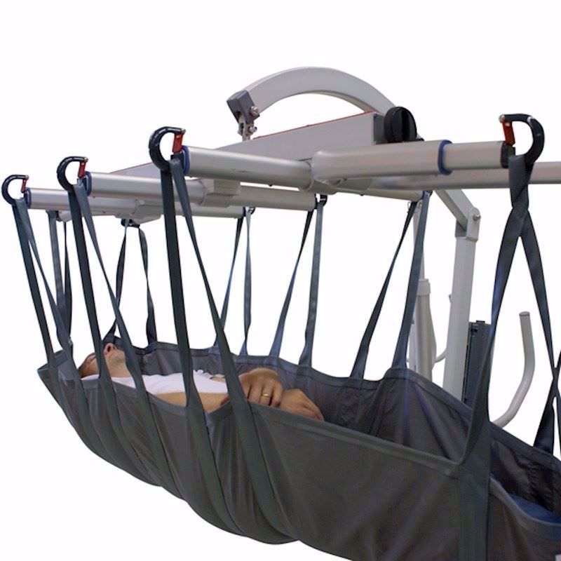 StretcherSling ist ein Hebetuch, das zusammen mit einem mobilen oder stationären Lifter und SystemRoMedic™ StretcherBar, einem Hebebügel mit besonderem Design, für Horizontaltransfers, das heisst zum Bewegen eines Pflegebedürftigen in liegender Position, verwendet wird.