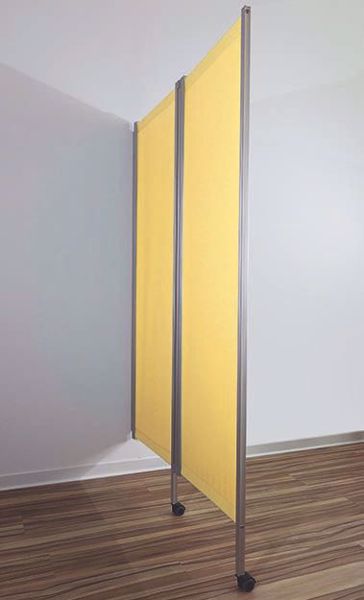 Die Trennwand ist in fünf verschiedenen Farben erhältlich - weiss, hellblau, beige, mint oder gelb, um den individuellen Vorlieben und Anforderungen gerecht zu werden. Der Rahmen besteht aus eloxierten Alu-Designprofilen, während die Fuss- und Abdeckkappen aus Polyamid in hellgrau gefertigt sind. Optional können Kunststoffrollen in Schwarz ausgewählt werden.